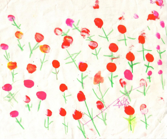 晚上,孩子吃完晚饭,就静静地待在自己的房间里,许久没有发出吵闹的声音。过了一会儿,她举起一幅画说:“妈妈,我种了好多玫瑰花!”