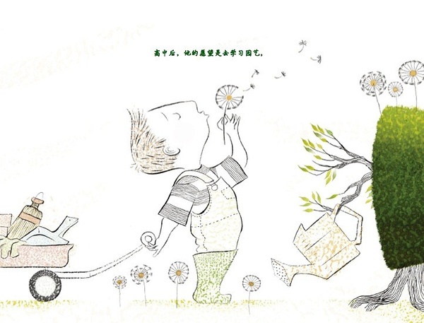 “像格林爷爷一样大的花园,请老鼠亚历山大、彼得兔、恐龙良太和光太、小猪奥莉薇和她的弟弟小恩来做客……我还要请阿莫帮我招待动物朋友们,请甘伯伯带我们去游河……”孩子继续说:“希望不一样的小豆豆来我的花园安家,这样花园就有很多很奇特的豆豆啦!”