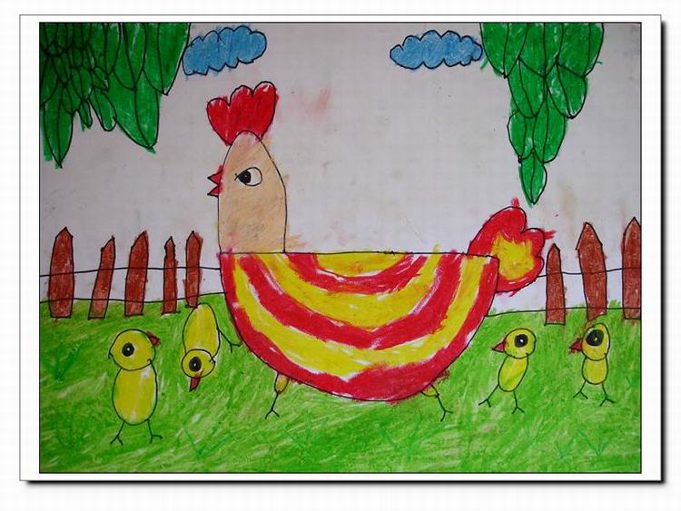 内容:我问小雨点:“小雨点,你画里都有些什么啊?” 小雨点指着这幅画说:“母鸡、小鸡、蓝天、白云、绿叶、青草地 !” 我说:”...