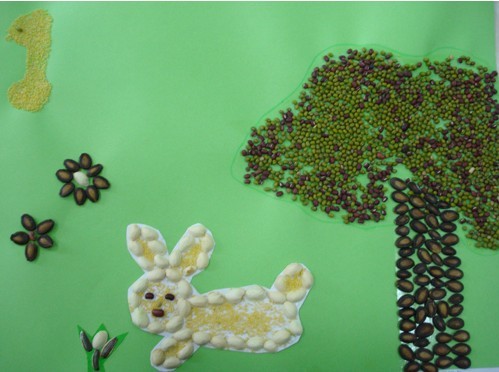上周,幼儿园举办了一场“亲子互动活动”,孩子和妈妈一起参加的。她们用豆粘成的画有点像《逃家小兔》里面的那只兔子。
