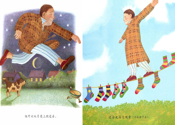 “不是!是因为……”他吞吞吐吐地说:“书上说:‘他可以从月亮上跳过去,还会走高空绳索(不会掉下来),他敢跟大力士摔跤,游得像鱼一样快……’”