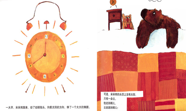 这是我第三次给孩子念《小烦恼》这个故事,每次我念到:“可是,呆呆熊的头顶上没有太阳,只有一朵云。他走到哪儿,云就跟到哪儿!”