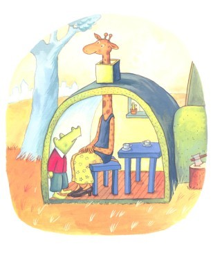 长颈鹿跟鳄鱼去了他家,鳄鱼家好小哦,长颈鹿只能让自己脖子弯着,扭着,要不,就从门或是烟囱出去,舒展一下,透透气。