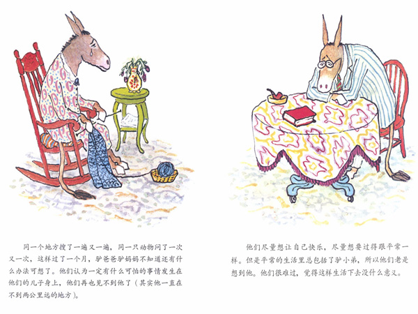 首先这本图画书有有美妙的故事情节,一个充满梦想的驴小弟了实现突获魔法石的梦想,这就像得了彩票,天上掉馅饼;可是魔法使用带来雷雨闪电的狂喜还没持续多久,驴小弟又遭遇了不测,遇到了狮子;他有厉害的魔法石嘛,我们大可不必为他担心;可惜,我们想错了。驴小弟毕竟是小弟,不是个老谋深算的老大,所以他小人家一紧张就把自己变成了石头;当时为了躲避狮子,这似乎还是个办法,可是狮子走后,就发现这是个蠢办法,因为魔法石放在一边了,只有拿在手上才能心想事成。可怜的驴小弟傻眼了,他变不回去了,成也魔法石,败也魔法石啊。可怜的驴爸爸驴妈妈等不回自己的宝贝儿子,问邻居,找警察,一天天,一月月,两个人伤心的度过,有次还在石头附近找过,可怜的驴小弟变成了石头,喊不出声来。看到这里,如果这是部电影或动画片,观众一定会揪心发急,小朋友观众甚至会喊出声来:那个石头就是驴小弟!就像无数丢失孩子的父母一样,驴爸爸驴妈妈坚信儿子还在人间,尤其是驴妈妈,她经常怀疑儿子就在附近!我们终于看到了富有戏剧性又激动人心的大团圆场面,故事的最后,亲人团聚了,魔法石却没用了,一番得得失失的经历,一家人都明白了,我们并不需要那些神奇的东西,珍贵的东西就在我们身边,我们更需要它!