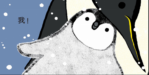 在开始的几个画面中,我们看到的是小企鹅的小与弱,它茫然地迷失在一大群企鹅之中,它娇憨地用翅膀挡住飞溅的水花;而在天空那么高一页中,不仔细寻找,简直难以发现那变成了小小一点的企鹅宝宝。