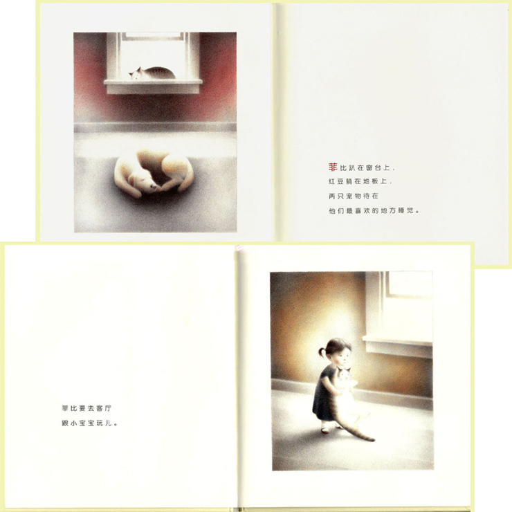这是一本描写两个好朋友日常生活的图画书,故事简短,文句简洁,主角是两只可爱的动物:狗儿红豆和猫咪菲比。有经验的小读者都知道,从故事一开始:“菲比趴在窗台上,红豆趴在地板上,两只宠物待在他们最喜欢的地方睡觉”——就会猜想这会是个有意思、有冲突,却又不失温馨的精彩故事。因为这两个主角虽然同样是圆滚滚胖嘟嘟的,同样受主人宠爱,却有截然不同的生活习性。