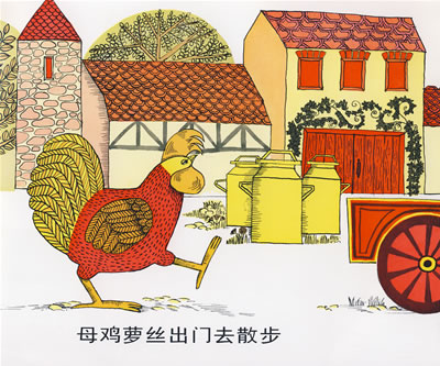 佩特·哈金丝把萝丝画得装饰味儿极浓,既像剪纸,又像刺绣或是毛衣上的图案,萝丝的头、翅膀及尾巴是黄色的,身体是朱红色的,还用黑笔在翅膀和尾巴上画上了羽毛状的花纹,在身体上画上了点点。至于那只倒霉蛋儿狐狸,她并没有因为它是一个丑角而丑化它,相反还把它美化了,画得妖魅无比,一对尖耳朵的轮廓和腿是深褐色的,耳朵和肚子是白色的,身体及长长的大尾巴则是橘黄色的,上面布满了由复杂的圆点、线条和黑三角组成的装饰性图案,就像一个美丽的狐妖。不只是鸡和狐狸,连后面的树、农家、风车等背景也都画得像装饰画一样。她画这本书时才是一个26岁的新人,不能不说是一个大胆的实验,不过,咿呀学语的幼儿却接受了这种变形的画法。
