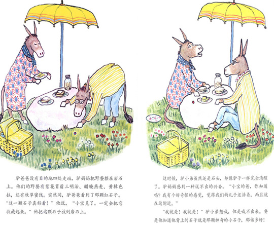 《驴小弟变石头》是威廉·史塔克的第三本图画书,写这本书时,他已年逾花甲,准确地说,已经是一位62岁的老人了,可是他却用大师之笔、孩子之眼,写出了这样一个洋溢在魔法之间的爱的故事。我们不能说他大器晚成,我们只能说他童心未泯。所以才会有人说威廉·史塔克拥有一种非同寻常的儿童特有的能力,在呈现充满幻想和奇迹的事件时,仿佛它们就是日常发生的那样。他的创作并不是源于自己的童年回忆,而是来自于某种童年本质,这种本质是任何大人都无法放弃,无法拒绝的,而幸运的力量,变身和重生的能力,好魔法的存在,所有这些都是这种“童年本质”的表现。