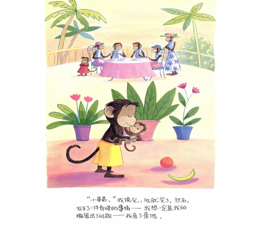 这是一个关于爱的表达的故事。也许是内容的需要,画家没有运用古典的手法来浓重复杂地勾勒具体场景,而是将视角始终深入森林内部,用铅笔勾勒出轮廓简洁的奇花异草、热带树木、河流积石并使其成为重要的道具,让珍禽百兽穿插其中,各自扮演自己的角色,由此营造出一个爱意浓浓的家园。画家给末末和他的家人穿上了优雅的服装,让他们住在带有环形平台的大树屋里,在森林中悠闲散步,甚至在夕阳下喝着可口的下午茶,这些都与主角小猴末末的反叛情绪形成对比。在每幅画面中,我们都能找到这个始终穿着黄色小短裤的小男孩,他时而露出不满的神色穿梭于林中,时而站在凳子上大声发表自己的宣言,时而四处躲避讨厌的亲吻,时而又对现实表示无奈……虽然从色彩和构图上画家并没有刻意去强调末末的存在,但她赋予末末的反叛性格及其外部表现却让我们总能一眼就认出他来。