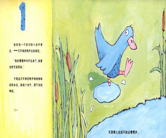 鸭子首先做了一个坚定地决定——要去把嘎嘎声找回来!她迈开了自己啪嗒啪嗒的步伐,走到水边,跳进小池子,潜下去找啊找。这只鸭子出发时的姿态和眼神你留意到了吗?是不是好像在说:“别怀疑喔。”不过,紧接着的寻找结果——“可是哪儿也找不到这嘎嘎声”,也着实让我们和这只鸭子一起体验到什么是当头一盆冷水。