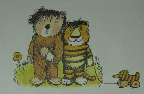 一头憨态可掬的小熊,一只顽皮可爱的小老虎,一个虎皮鸭嘴四轱辘的手拉小车,还有一个又一个朴拙逗人的小耗子、小兔子、小猪、大象、鹅阿姨……
