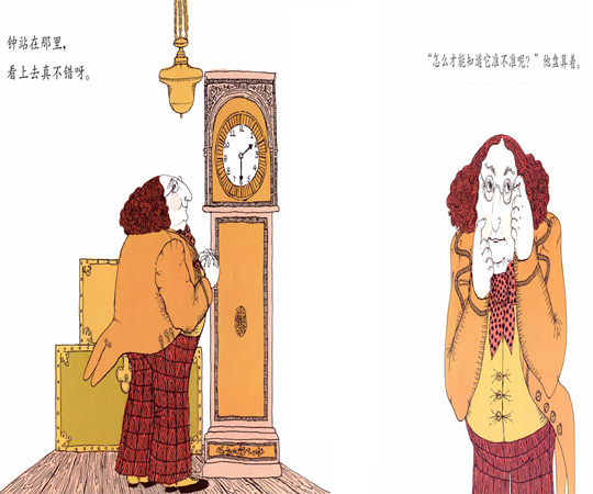 这就让人不能不佩服作者佩特·哈群斯超凡的想象力和独具的匠心。看着胖墩墩的金老爷在家里狭窄的楼梯上一次次上下,看着他为买钟一趟趟外出奔波,我们真是有些不忍心,却又实在忍不住笑,忍不住盼望故事不要很快结束,好让金老爷继续这么辛劳下去。毕竟,金老爷上上下下、来来去去的这些举动,真的是太有趣了。