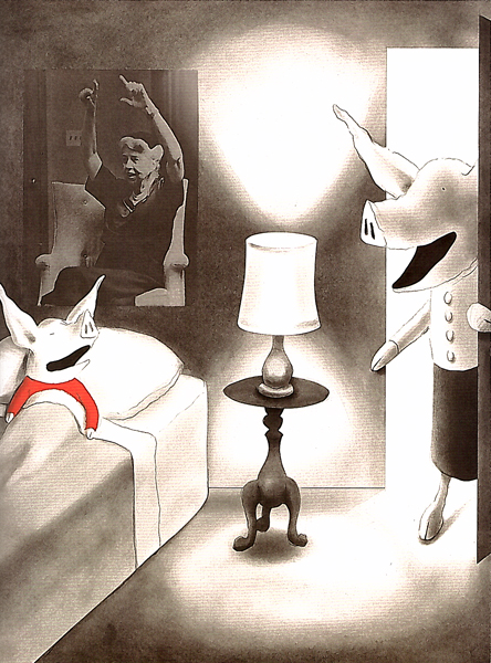 当我们的视觉跟随奥莉薇移动时,您一定发现了一个细节:奥莉薇给大家报告“假期见闻”时讲到妈妈带她和弟弟去看马戏,那马戏团大帐篷上的红色和奥莉薇身上一贯的红色是不一样的。奥莉薇一进入马戏团的帐篷,就像进入了一个幻想之门,画面中所有的红色都变成浅红色,包括奥莉薇自己身上的红色。直到奥莉薇讲完,爸爸带她去远航时,船上奥莉薇小小的身影又恢复了那色彩纯正的红色。难道是马戏团的灯光使那红色发生了变化?那为什么卧室的黑暗、床头的灯光不能使色彩改变呢?从画家的创作风格来说,这变浅了的红色应该有某种寓意吧?和看过很多图画书的女儿讨论起这个问题,女儿说:“因为是奥莉薇讲的故事,故事里的画就用了浅红色呗!”我叹服孩子的理解力,画家或许真是用红色的纯度来区分故事里和故事外,现实与幻想……