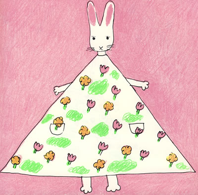 看上去,这些画不是很幼稚吗?不要说一个画家了,随便哪一个孩子都画得出来。不说别的, 你看那个小兔子,圆脑袋,三角形的连衣裙,都是再简单不过的线条和形状了。画的颜色也是单色,这不是太像孩子们在纸上的信笔涂鸦吗?是的,这正是西卷茅子的追求。她追求的就是这种效果。这才是孩子们自己的世界,他们会觉得熟悉和亲切。她教过孩子们画画,她知道你只要给孩子们一张纸和画具,他们什么都不会去多想, 就是本能地画下去。这对她启发特别大,她说孩子们的1画是她创作的原点,她在画画的时候总是一遍又一遍地告诫自己:要像孩子们那样去画画,不要总是想着一定要把它画好。