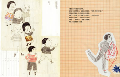 这是一个寓言式的故事,优美而充满哲理,画家为此特别选择了碎片式的拼贴手法来处理,着力于意象的营造而非具体景物的刻画,用各种手段组合出玛明若隐若现的世界。比如玛明住在乡下的村子里,他从来不记得那个村子的名字,画家的表现就跳脱了对普通村庄景色的描绘,而只用一堆线条的组合和一个彩色的稍具形象的房子,引领我们进入玛明断断续续的记忆当中。村里人将自己锁在家中的那个画面,画家也只是用不同材质框出了家的范围,并没有表现家里的陈设,但画面中尘埃般的灰色和凌厉的线条所制造出的不安气氛却让人更加印象深刻。而后一页人们互相责骂,画家将四个层次不同却造型相近的人物方向颠倒地置于一张画幅内,那一样的眼神造成的互相猜疑的效果同样非常强烈。这些充满了结构感的、碎片化的画面同故事在我们心中的原有印象既存在距离,又有呼应,大大扩展了故事的想像空间。