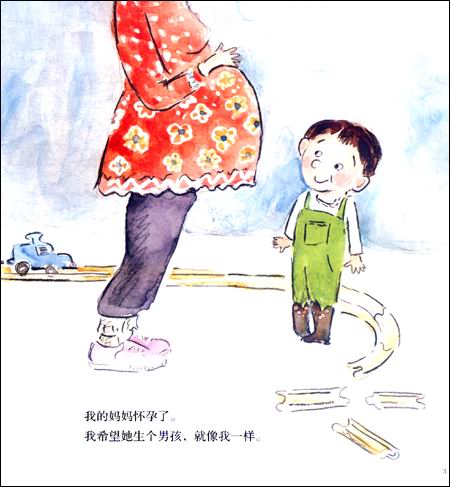 看似不经意地,妈妈让爱德华帮忙给小宝宝起名字。自然而然地,爸爸和爱德华一起去看妈妈给小宝宝准备的衣服,那可全是爱德华穿过的衣服啊,这一下子拉近了爱德华和小宝宝之间的距离。而且,爸爸貌似随意地追问:如果小弟弟变成了小妹妹呢?虽然爱德华的反应似乎更加激烈而任性,竟然要把小妹妹送人,但也因此在他小小的心灵中预埋了一粒与自己一向的期待相悖的种子。当爱德华越来越迫切地期待小弟弟的到来时,妈妈让他与小宝宝对话,让他的心与小宝宝更加贴近了。尤为可贵的是,妈妈在去医院之前还没有忘记把爱德华拥在胸前,给他一如既往的关注和爱抚。尽管最后爱德华的期待还是落了空,妈妈带给他的不是小弟弟而是小妹妹,可是这又有什么关系呢,割不断的血缘与亲情就是那么神奇,它让爱德华身不由己地做出了他原本一味排斥的事情——轻轻地吻了吻小妹妹。到此,爱德华内心的失落终于得到了最好的补偿。