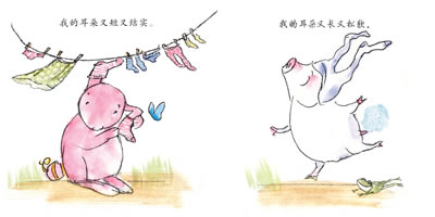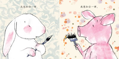 一只小兔,一只小猪,天生不同。“我想和你一样”。喜欢一头粉红色的猪,就要把自己也涂成亮粉;喜欢一只白色的兔子,就要把自己也刷成浅白。瞧,要整容塑形的部位还真不少呢!是拖着柠檬皮一样卷卷的尾巴,还是假装棉花糖一样蓬蓬的尾巴?是竖起又短又结实的耳朵,还是耷拉着又长又松软的耳朵?是翘起纽扣般的鼻子,还是非要有最长的脚趾头?反正,“我百分之一百愿意为你改变!”“我愿意为你改变百分之一百!”