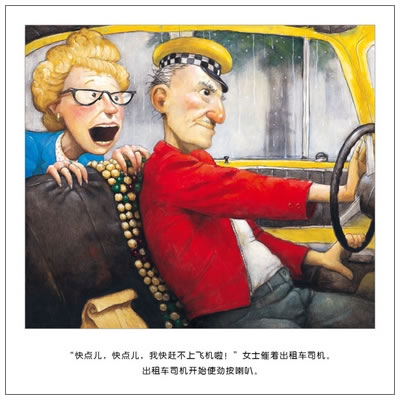 一位女士正催着出租车司机赶往飞机场,出租车司机皱着眉头,身体后倾,用右手奋力地按着喇叭。即使是一张图画,也能感受到司机正不停地按压着方向盘的中央,充满了烦躁。一把撑开的雨伞,也能让两个人愤怒地争吵。这场突如其来的雨,扰乱了大家的生活。大雨下,车辆死死地堵住了狭小的马路,司机们探出头愤怒地按着喇叭,观察着前面的路况。形形色色的人拥挤在道路两边,或吵着架,或比划着据理力争,老夫人的东西撒了一地,水果摊老板的水果也滚落到四处……一切简直糟透了!