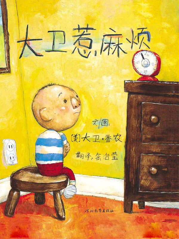这时候,宝宝自信地引着我来到桌角,一本好像幼儿涂鸦的图画书出现在我的眼前----《大卫惹麻烦》。