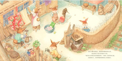 这本书的大部分场景是按照儿时记忆来画的:土坯房、土院墙、衣绳上鲜艳的大花被子、院门口的酱缸……真实的家就是这个样子,这个院子是我和爷爷、奶奶、爸爸、妈妈、兄弟姐妹们一起生活过的小院。当我画它的时候,仿佛又回到家乡,推开那扇小木门,飘来妈妈煮饭的香味,听见爸爸叮叮当当干活的声音……我的大部分童年是在这里度过的,和家人过着勤劳朴实、春种秋收的简单生活。那时候的我们没有高级的玩具,没在游乐场里坐过小火车,没看过海底世界,甚至连看电视都是奢侈的事情,但我的童年却一点也不缺少快乐。
