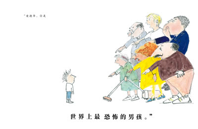 出版于1997年的《爱德华——世界上最恐怖的男孩》,书名是一个带有定性描述意味的句子,配上封面上头发乱糟糟、衣服脏兮兮、一脚踢开布娃娃的男孩形象,再联想到伯宁罕一直喜爱以儿童生活为主题来绘制故事,倒真是让人好奇这薄薄十几页的小书不知又讲述了怎样一个“恐怖男孩”的故事。