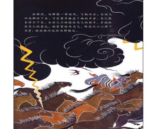 本书插图风格也与神秘相伴而行。在亮丽的色彩和大色块的涂抹背后,作者笔下的很多人物脸庞模糊,五官的描绘很少,似乎画家重视的不仅仅是原始部落中人们的服饰、轮廓及外显的表象,而是想努力将这些图案模糊划、典型化,从而使之带上一种具有表征意义的图腾特色。故事开始时少女骑在马背上的优美身影,故事结尾处两匹马缠绕在太阳光辉下的身影,都有着溢出画面之外的深长含意。
