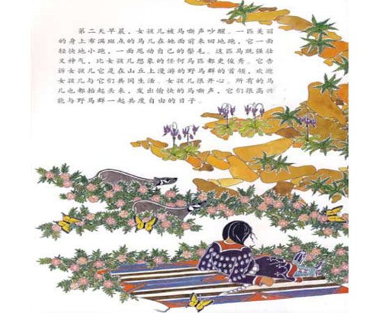 《野马之歌》这本书用水彩创作,却没有湿润淋漓、水色氤氲的传统水彩画特点,以至于人们误以为是中国工笔画,那是因为作者使用了类似勾线、设色这样的工笔技巧。但是保罗戈布尔所用的勾线设色却独具特色:他用黑色勾线,但着色时在黑线外留白,这又形成和黑线并行的白线,使得物体具有了黑白双重勾线的效果,形成版画似的雕刻感觉,显得轮廓更加清晰明确;在设色时,作者的手法也不同,几乎不用传统工笔画的晕染技法,而是大面积使用了平涂着色法。画家们都知道,平涂最容易使画面显得单调呆板不生动,可是本书画面却色彩鲜艳而丰富明朗,原因是作者太善于运用同类色的微小差异了!比如同一片石滩上的几块卵石,一种色调,但这块重一点、那块轻一点;同一簇秋天的叶子,这片黄一点、那片红一点;一起奔跑的马儿这匹深一点,那匹浅一点……这样利用同类色之间微妙的冷暖、轻重等色彩差异并置在一起,虽然是平涂,却非常丰富而生动!即使在处理一簇野草几丛花儿时,为了要表达郁郁葱葱的感觉,偶用叠色技巧,也是以同类色相叠,所以画面非常干净、清爽悦目却不失色彩的细微变化!