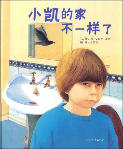 看一看故事中小凯房间里悬挂的装饰画,有凡高充满神秘色彩的星空,有宇宙星球、日食和ET,创作者笔下的小凯应该是一个对未知世界充满好奇的孩子。爸爸留下的一句话并没有指明变化在哪里,却在充满好奇的小凯的心里引起了轩然大波。创作者以第三者的角度在描写小凯所看到的景象的同时,也在画中给出了一些暗示:比如小凯坐在沙发上,考虑是不是沙发会变成鳄鱼,而他背后的画,是那幅圣母送孩子到人间的图画。接下来的两页,小凯注意到单人沙发好像变成猩猩,鳄鱼的尾巴变成了香蕉。在这个时候,旁边电视机里正在播放的是大鸟飞回窝里时,里面有一颗不一样的蛋,在电视机出现后的第一个页面上,小鸟反过来在哺育大鸟,相机上面的镜框里,小凯的旁边多了一头猪。这些暗示是不是意味着,小凯对于家庭成员的变化,也有猜测呢?总之,小凯不明白,他推开门,偌大的家中只有他一个人。此时,画面中淡蓝色的房间流露出清冷静谧的气氛,门外一片迷茫的白色将小凯因犹豫而略略前倾的背影衬托得益发惶惑不安……
