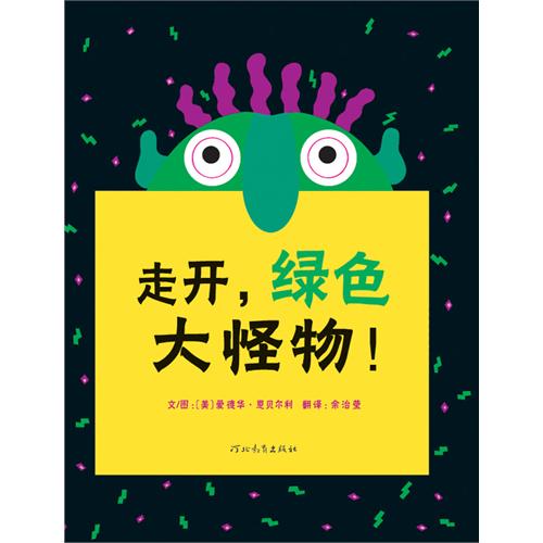千万别以为《走开,绿色大怪物》仅仅是因为这些奇特的洞洞才如此迷人。其实作者把色彩心理运用得到位极了。整整半本书,用黑色营造神秘恐怖的气氛,一开始似乎在暗夜里有一双神秘的眼睛在窥视我们!在儿时,谁的心里没有盘踞过对怪物的恐惧呢?又有哪个孩子没有怕黑夜的感觉呢?也只有在黑色的衬托下,那怪物的黄眼睛才恐怖而且神秘,那一页页出现的蓝色鼻子、红嘴白尖牙和大绿脸才如此鲜明而富有个性,就像从黑夜里向我们越走越近的一个梦魇!