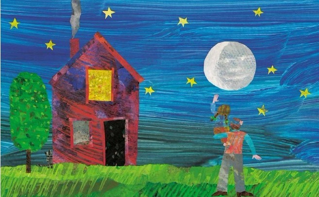 在艾瑞•卡尔的《爸爸,我要月亮》(初版于1986年)的故事中,我们见识了另一种回答,而作者正是那种敢毫不犹豫地说“我这就去拿月亮” 的图画大师。