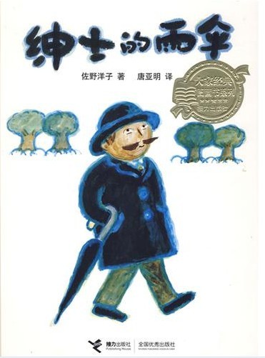 换一个画面,你可以感觉到呼之欲出的老爷爷的小固执——他是用背来对着你——他的执拗就像挺直的背一样硬梆梆。小猫的神情也很有意思,它的脸是往右看的(看向画面外),自然而然地吸引了读者想翻页看看后面会发生什么故事。这把雨伞其实便是一种语言的表达——老爷爷到哪儿都离不开它,下面几个画面,画家用不同的肢态语言表达了这样的意味:到那儿一定会带上老朋友。晴天时挎着伞,小雨时护着伞,雨越下越大,更是全力以赴爱护着雨伞。你看他那倾斜的姿势,已经用自己的全力替雨伞撑起一方天空。回到家,他的眼神,那样温柔凝注于雨伞——这份珍爱的情意,让我也跟着感动了…… 对心爱东西的珍贵,这情结,每个人都应该有体会。画家悄悄地从环衬上就开始在设计——绅士把雨伞藏在身后,就像一个小孩急着把自己心爱的东西藏藏好,生怕被别人看到,那种对宝贝紧张的感觉,反而遮掩不了。我们看出他的小动作后,忍不住会微笑起来。又下起了小雨,接下来会发生什么呢,还会和以往一样吗?急着想翻页看看吧。 小男孩来借雨伞了,然而,连续几页的老爷爷的背影,已让人感觉到一种拒绝的气氛,这与后页中,两个正面表现的小孩友好的画面形成了鲜明的对比。